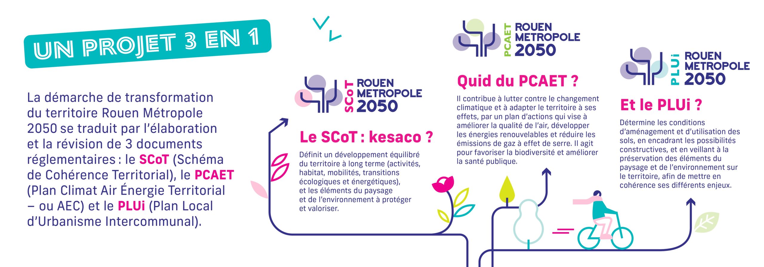 L’élaboration du SCoT et du PCAET, comme la révision du PLUi sont 3 démarches s’inscrivant dans la même dynamique, celle de définir la feuille de route et les outils qui permettront d’atteindre un territoire désiré à l’horizon 2050. Les démarches sont donc considérées comme un unique projet, traduisant une vision du territoire à 2050 déclinée dans les différents documents de planification.